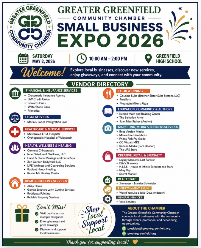 The Greater Greenfield Community Chamber invites local businesses and organizations to participate in the Small Business Expo 2026, happening Saturday, May 2, 2026 from 10:00 AM – 2:00 PM at Greenfield High School.